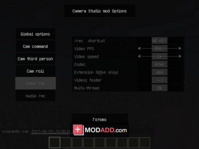 В игре появится специальное меню, в которым Вы сможете разузнать первичную информацию о моде, а также настроив его под себя. После того, как игрок освоится, ему откроется возможность снимать видео прямиков в игре, используя различные виды. Например, прописав определенную комманду, Вы запустите медленное вращение камеры по оси вокруг игрока (расстояние и направление Вы вибираете сами). Также в игре присутствует Timelapse.